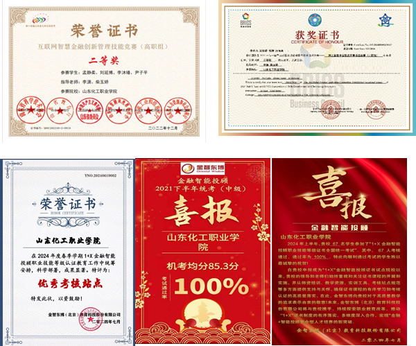 本专业把1+X金融智能投顾职业技能等级证书标准融入高职金融课程,推动课程体系建设,证书认证通过率达100%。与中国大地财产保险股份有限公司、中国平安人寿保险股份有限公司、山东京北方金融科技有限公司等企业建立了战略合作关系,构建“校内实训+创新创业平台+技能竞赛+校外实习基地”四元一体实践教学平台和课岗、课赛、课证深度融合的“产教融合、多元育人”教学模式。学生参加2024一带一路暨金砖国家技能发展与技术创新大赛——第三届数字金融应用赛项总决赛,获得三等奖1次、优秀奖1次,参加互联网智慧金融创新管理技能竞赛,获得二等奖1次、三等奖1次,参加山东省大学生互联网金融创新与运营管理大赛,获得二等奖1次、三等奖1次。