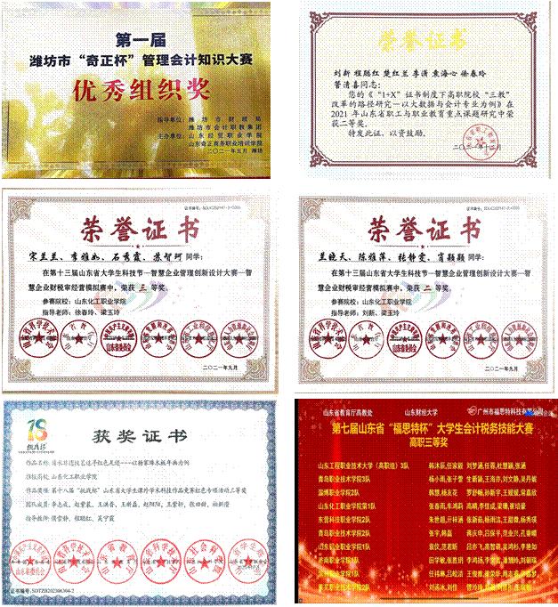 本专业把1+X业财一体化职业技能等级证书标准融入高职大数据与会计课程,推动课程体系建设,证书认证通过率达96%以上。与潍坊泰盈信息科技有限公司、潍坊百货集团股份有限公司、山东凯瑞酒店管理建立了战略合作关系,构建“校内实训+创新创业平台+技能竞赛”三元一体实践教学平台和岗课赛证深度融合的“产教融合、多元育人”教学模式。学生多次参加山东省大学生科技节,获得二等奖多次,参加挑战杯红色专项获得省三等奖,参加学创杯、福思特杯比赛获得多项三等奖。