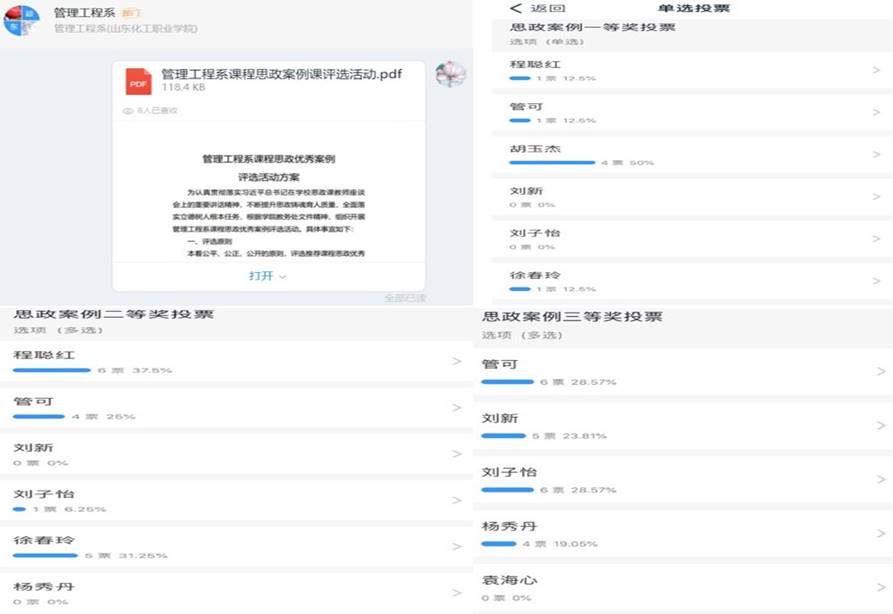 评选结束后,组织将获奖课程发布到系群里,供所有任课教师相互借鉴学习,促进课程思政教学质量提升。下一步,管理工程系将依托“强化课程思政建设 提升人才培养质量”重点项目,持续推进课程思政示范课、课程思政案例库建设,推动课堂革命,全面提升专业课程的思想性、理论性和亲和力、针对性,真正做到“守好一段渠,种好责任田”,努力培养德智体美劳全面发展的社会主义建设者和接班人。(文/楚红兰)