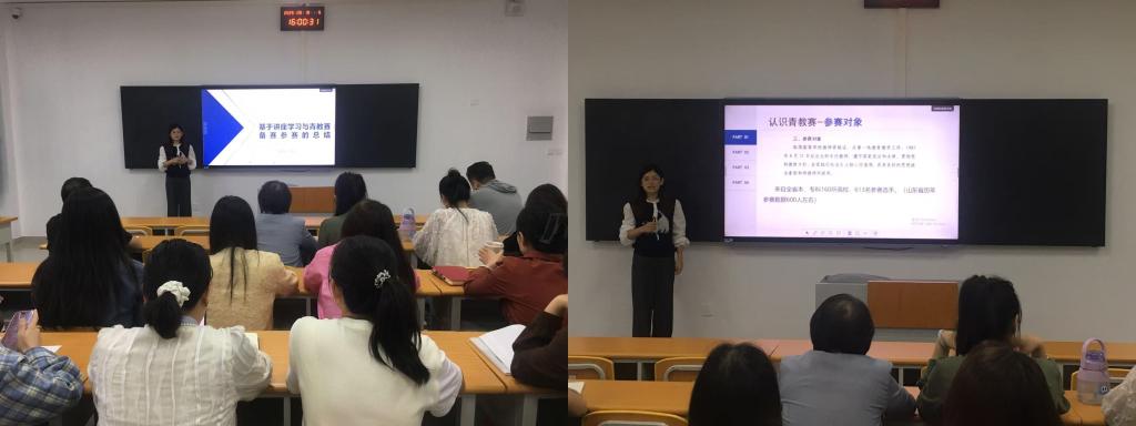 分享会上,梁老师先以“认识青教赛”为主题,系统解读赛事定位、规则与评审维度,强调其既是检验教学水平的“试金石”,也是促进教学反思与创新的“催化剂”,鼓励教师积极看待、主动参与。