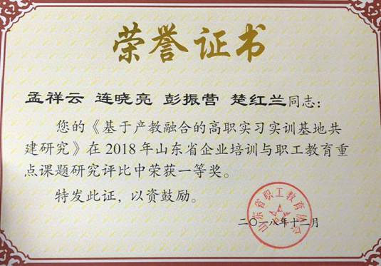 2018年12月21日,山东省职工教育2018年度工作会议在济南召开。会上,揭晓了2018年山东省企业培训与职工教育重点课题研究结题及评选结果,管理工程系孟祥云主持的《基于产教融合的高职实习实训基地共建研究》荣获2018年山东省企业培训与职工教育重点课题研究一等奖。