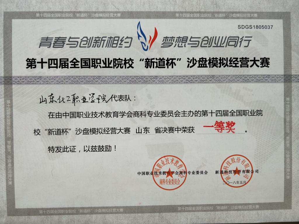 5月26日,第十届山东省大学生科技节创新创业模拟企业经营大赛(职业院校组)暨第十四届全国职业院校“新道杯”沙盘模拟经营大赛山东省总决赛在山东水利职业学院举行,山东化工职业学院管理工程系楚红兰、袁晓玲两位老师共同指导的两队选手分获一、二等奖。其中:2016级市场营销一班赵英杰、岳贤龙、李恒光、毕永康、刘晓等荣获高职组一等奖;2016级市场营销二班马浩、王晨、程志、张文琳、荆超凡等荣获高职组二等奖。