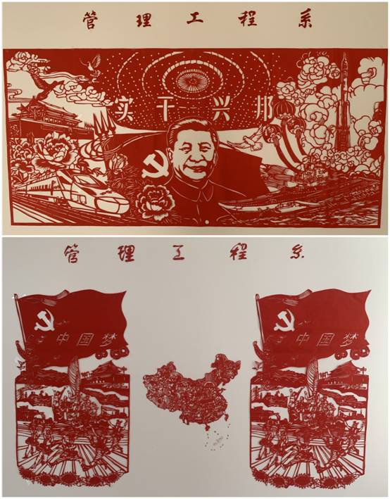 管理工程系教师刘斯耗时90小时制作的剪纸作品《一个核心、一个梦想》,寓意在以习近平同志为核心的党中央坚强领导下,党和国家事业发生历史性变革、取得历史性成就,中国特色社会主义进入新时代,中华民族伟大复兴的“中国梦”一定能实现,此作品引起广大师生热烈追捧,微信投票支持率名列前茅。