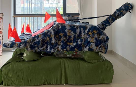 此作品参照中国中国人民解放军的第一辆坦克“功臣号”制作,“功臣号” 在解放战争中战功卓著,享有了第一个带队驶过天安门广场的殊荣,使得这辆坦克与共和国的历史融入在一起。学生们收集了上千个矿泉水瓶和废纸壳,制作出了这辆国之重器,重现了“功臣号”的风采。