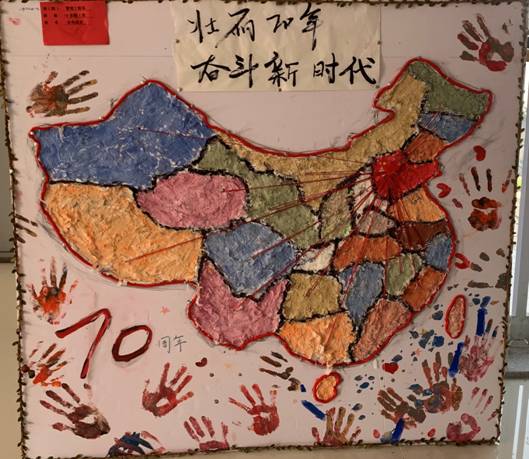 同学们用彩泥制作的中国行政区划图,每个省份都有一条红线连着中央,每个手心都朝向中央,寓意全国各地、全国各族人民紧紧团结在已习近平同志为中心的党中央,同心同德,开拓进取,奋力谱写中华民族伟大复兴中国梦的新篇章。