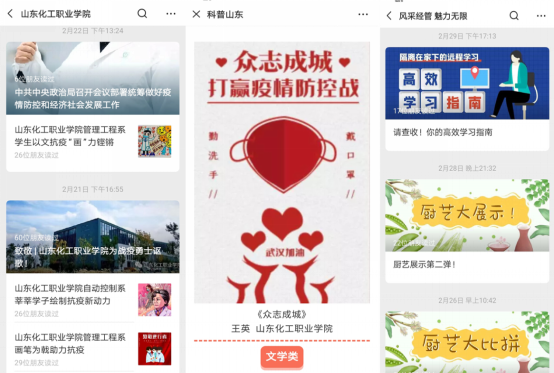 居家抗疫,为了丰富师生文化生活,管理工程系号召全体师生疫情防控有作为,特殊寒假不虚度。积极开展抗疫作品征集活动,老师和同学们分分拿起手中笔,用视频、图画、诗歌等作品为抗“疫”加油打气,提交作品上千件,百余件作品在学院、系公众号展示,学院公众号推出5期管理工程系专题作品展示,我系学生创作的3件作品在科普山东公众号展示。组织毕业班学生参加网络大学身职业生涯规划公益课,为实习就业做好思想准备。学生会组织了“厨艺大比拼”活动,号召同学们为父母做便饭、献孝心,感受家庭的温暖。
