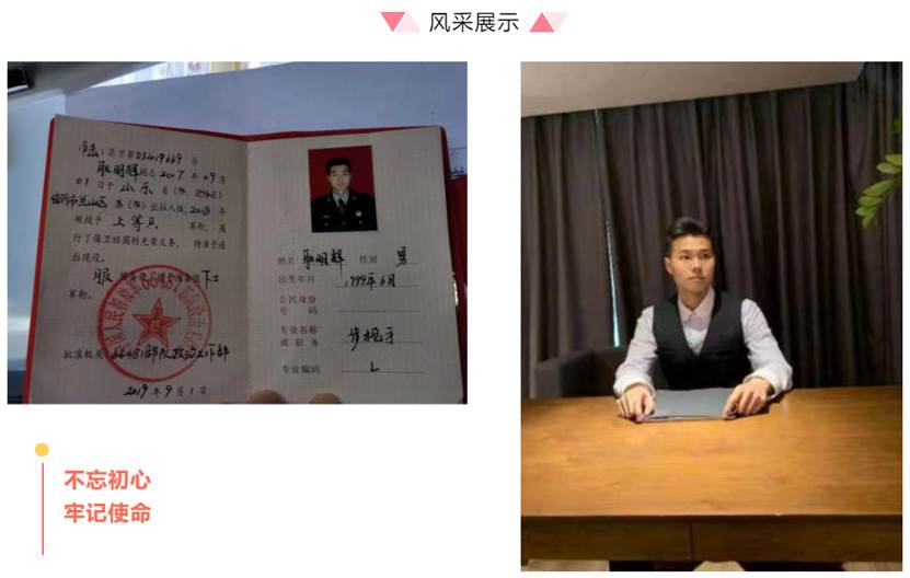男,2017年入伍服役于中国人民武装警察部队,2019年光荣退伍现就读于山东化工职业学院管理工程学院2019级会计九班,曾担任院学生会体育部副部长,早操开展顺利,加强了同学们的体育锻炼,以军人的身份严格要求自己,遵从学校校规校纪,积极参与学校的各项活动,起到带头作用;学习努力,品学兼优,为人善良,与同学之间相处融洽,互帮互助。