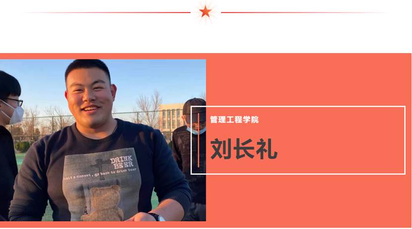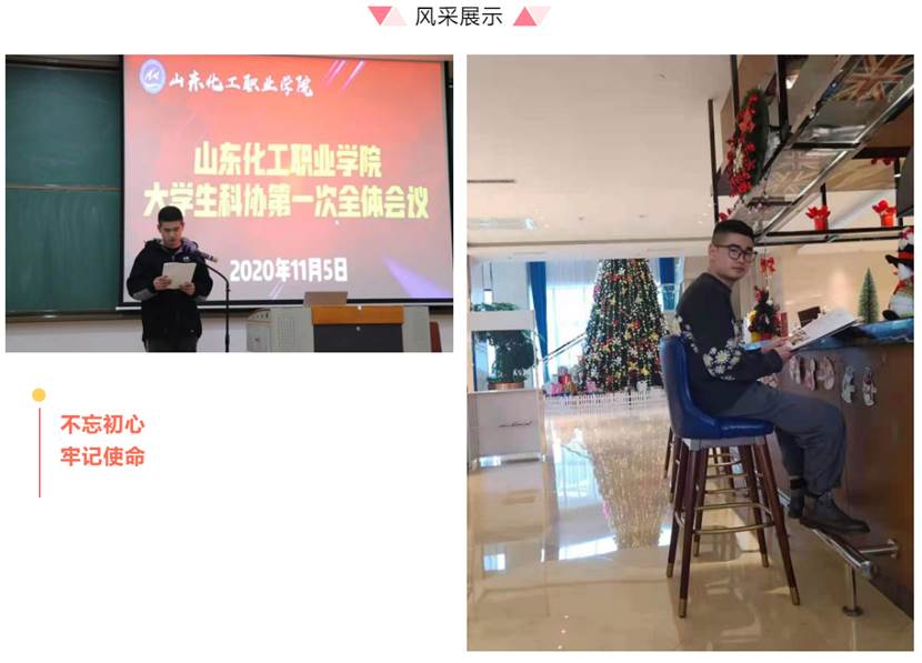 男,2017年入伍服役于中国人民解放军北部战区第78集团军,2019年光荣退伍现就读于山东化工职业学院管理工程学院2019级市场营销一班,现任管理工程学院学生会主席,在2019年积极响应党组织工作,完成团组织任务,荣获“优秀团员”称号,在2020年抗击疫情,积极参加阻击疫情·战“疫”有我”比赛,在比赛中作品突出,荣获“文学类 二等奖”。