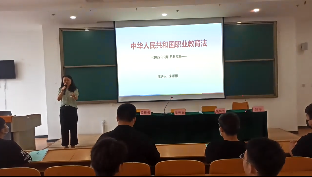 会议第一项,由朱彬彬院长解读《中华人民共和国职业教育法》。朱院长通过理论讲解与案例分析从新职业教育法修订背景与重要意义、新职业教育法的主要内容、新职业教育法与“我”的关系三个方面对职教法进行了系统、细致的解读。引导学生树立正确的职场价值观,利用好岗位实习期学会与人沟通、合作,为将来就业、创业打下坚实基础,并对实习学生表达了殷切的希望和诚挚的祝福。