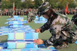 紧接着进行内务整理展示,学生熟练地运用“压、折、挤、掏”等基本动作,快速完成了从棉被到“豆腐块”的升华,展示了日常训练水平。