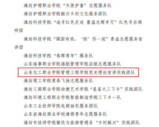 近日,团省委下发了《关于“调研山东”——2022年山东省大中专学生志愿者暑期“三下乡”社会实践活动的通报》,对“三下乡”社会实践活动中表现突出的集体和个人予以通报表扬,其中管理工程学院“党史理论宣讲实践团队”获评2022年山东省“三下乡”社会实践优秀服务团队,张灏强获评2022年山东省“三下乡”社会实践优秀指导教师,管理工程学院宿世悦获评2022年山东省“三下乡”社会实践优秀学生。