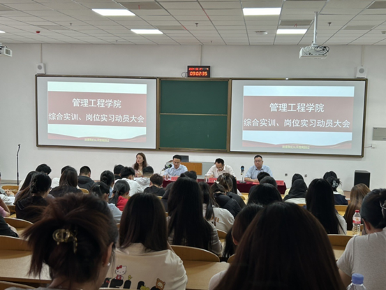 6月27日上午,管理工程学院2022级学生综合实训和岗位实习动员大会在主校区10号阶梯教室举行。学校教务科研处副处长丁竹青、学生工作处副处长陈恒亮、管理工程学院院长朱彬彬及2022级全体学生参加大会,会议由刘宁老师主持。