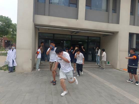 消防安全应急疏散演练以模拟7号宿舍楼7楼7217宿舍起火为演练背景。随着演练开始,相关负责人赶到指定位置维持学生疏散秩序;安保人员到达现场维护周边秩序,疏散无关人员,确保救援车辆路线畅通;各负责人带领学生用毛巾衣袖等捂着口鼻,低姿有序地按指定路线疏散;全部人员撤离到安全区域后清点人数并向总指挥报告,救援人员进入火灾区域营救被困伤员并成功救出,医护人员第一时间急救确保人员被困人员安全。