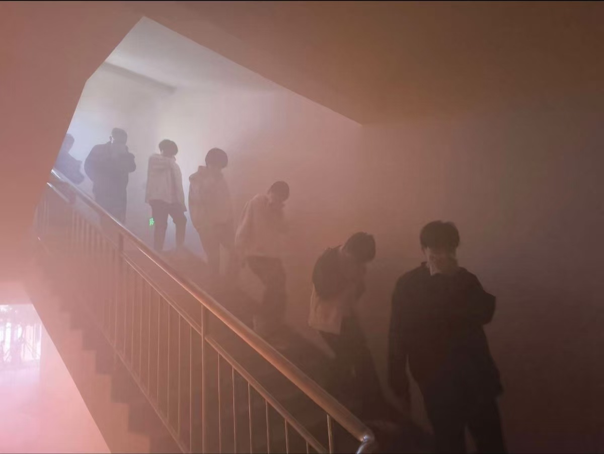 消防宣传人员结合火灾真实案例展开讲解,从火灾易发情况、应对措施、使用灭火器等方面进行了全方位的消防安全知识普及。讲座之后,来到7号宿舍楼进行实地演练,随着急促的消防报警声响起,消防应急疏散演练正式拉开帷幕,在疏散人员的指引下,841名学生用湿毛巾捂住口鼻,扶住墙面,弯腰快步前行,井然有序地沿着逃生路线撤离到安全地点。集中完毕后,各楼层负责老师清点学生人数,保障每位学生做到安全撤离。整个疏散演练过程有条不紊、井然有序。