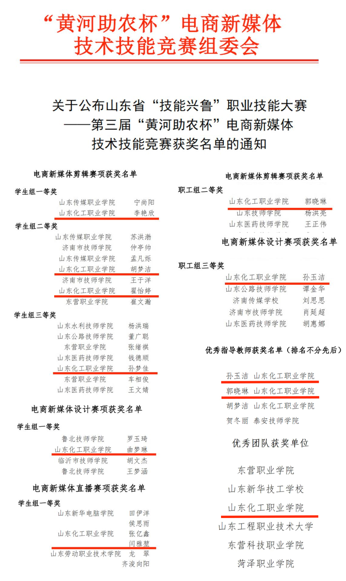 11月20日,2024年山东省“技能兴鲁”职业技能大赛—第三届“黄河助农杯”电商新媒体技术技能竞赛在东营职业学院落下帷幕。大赛共有来自全省30家院校和企事业单位代表团的300余名选手参赛,经过两天激烈的比拼,我校管理工程学院网络营销与直播电商专业9名参赛师生勇夺一等奖3项、二等奖3项、三等奖2项,孙玉洁、郭晓琳老师荣获优秀指导教师奖,山东化工职业学院荣获优秀团队奖,开创了我院在这一赛项中的新佳绩!
