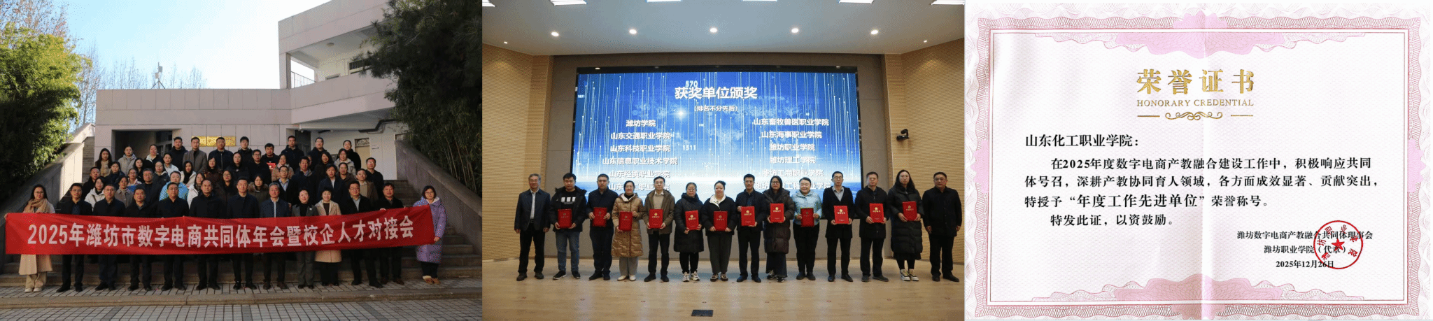 近日,以“数智赋能·产教共生——构建数字商务‘四链融合’‘五业协同’新生态”为主题的2025年潍坊数字电商产教融合共同体年会暨校企人才对接会成功举办。共同体理事单位、各高校及企业代表齐聚潍坊,共同探讨数字电商领域产教融合的发展路径。会议分为校企对接会、全体会议两个环节,内容丰富、成果丰硕。我校凭借在数字电商产教融合建设方面的突出成效,荣获潍坊数字电商产教融合“年度工作先进单位”称号。