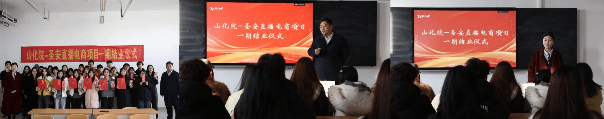 为深化产教融合、校企合作育人模式,培育适配行业发展需求的高素质应用型直播电商人才,1月9日上午,山化院-圣安直播电商项目一期结业仪式在4307隆重举行。山东圣安电子商务有限公司总经理范云鹏、网络营销与直播电商专业负责人郭晓琳及全体结业学生齐聚一堂,共同见证学习成果,定格成长荣光。