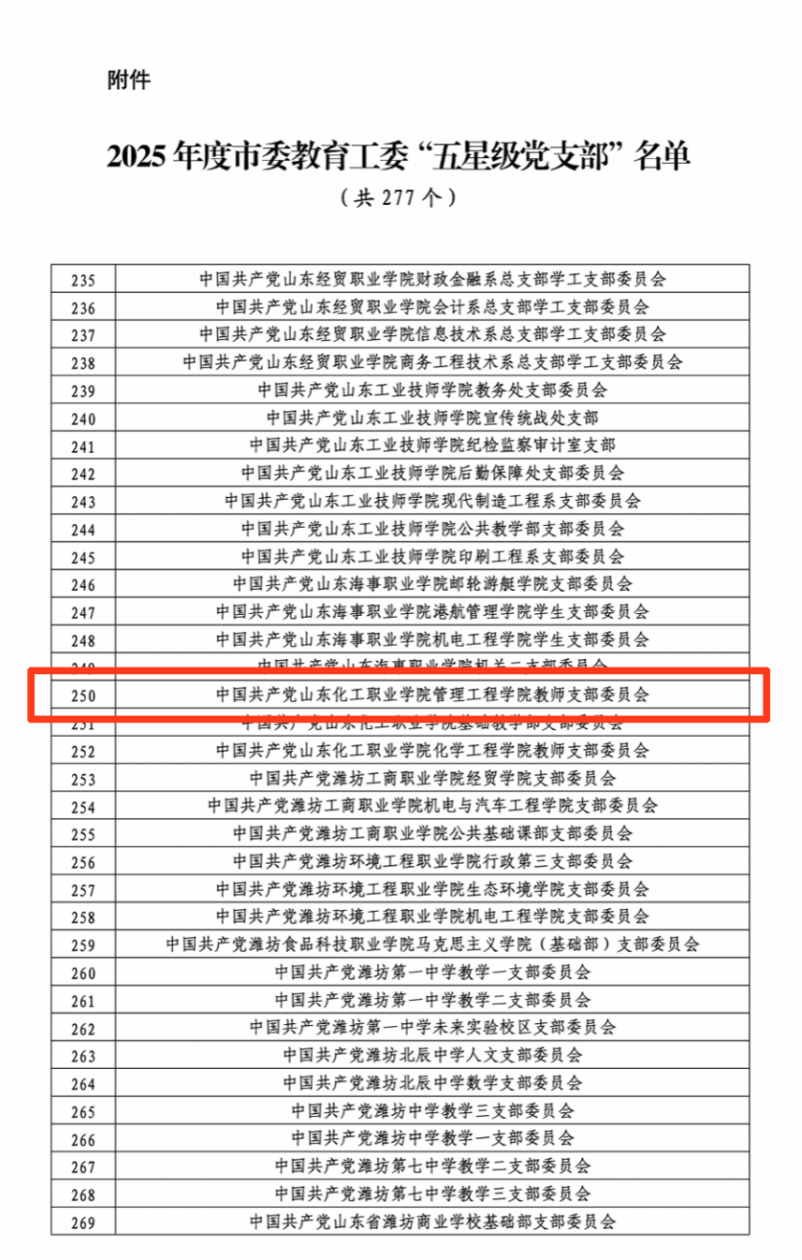 近日,中共潍坊市委教育工委公布2025年度“五星级党支部”名单,我院教师党支部凭借出色的党建工作表现成功入选,这不仅是对党支部工作的高度肯定,更是学院党建工作迈向新高度的重要标志。