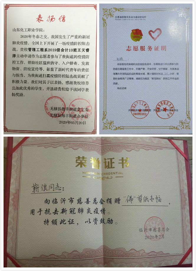 这些同学不计报酬不计得失,作为社区和乡镇志愿者坚守防疫一线,为居民测量体温、出入登记、清洁消杀、采购物资、取回快递……他们成为了社区防疫的“守门人”,也是服务人民生活的“贴心人”。最终,一张张荣誉证书记录了他们奋斗的全过程。
