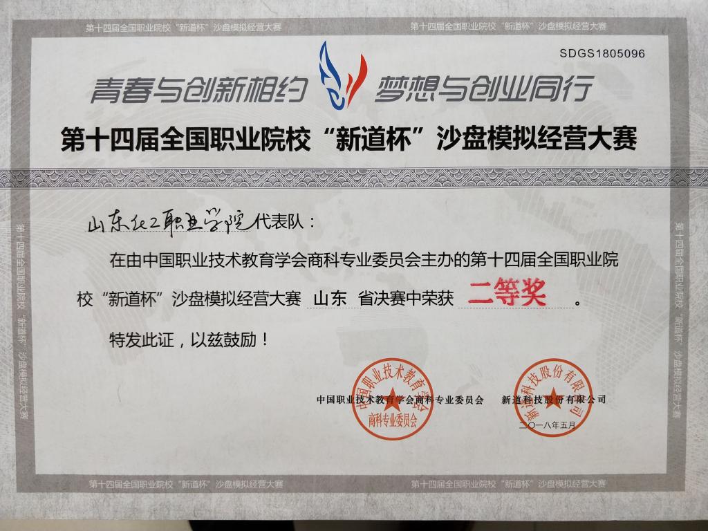 5月26日,第十届山东省大学生科技节创新创业模拟企业经营大赛(职业院校组)暨第十四届全国职业院校“新道杯”沙盘模拟经营大赛山东省总决赛在山东水利职业学院举行,山东化工职业学院管理工程系楚红兰、袁晓玲两位老师共同指导的两队选手分获一、二等奖。其中:2016级市场营销一班赵英杰、岳贤龙、李恒光、毕永康、刘晓等荣获高职组一等奖;2016级市场营销二班马浩、王晨、程志、张文琳、荆超凡等荣获高职组二等奖。