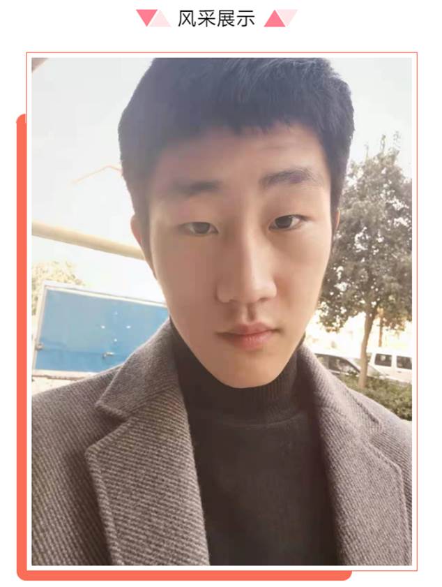 男,2017年入伍服役于中国人民解放军北部战区第78集团军,2019年光荣退伍现就读于山东化工职业学院管理工程学院2019级市场营销一班,现任管理工程学院学生会主席,在2019年积极响应党组织工作,完成团组织任务,荣获“优秀团员”称号,在2020年抗击疫情,积极参加阻击疫情·战“疫”有我”比赛,在比赛中作品突出,荣获“文学类 二等奖”。