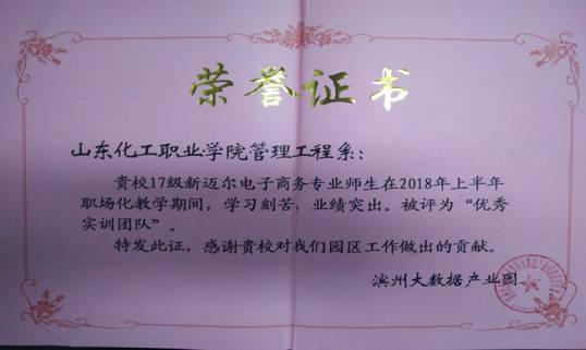 2018年5月23日,山东化工职业学院管理工程系2017级新迈尔电子商务企业班35名学生带着学院领导、老师的嘱托、家长的期望赴滨州大数据产业园开展为期三个月的职场化学习实践。8月21日,电商客服实训顺利结束,同学们满载而归。学生的实训表现得到了滨州大数据产业园领导的高度认可,在8月份产业园200多名工作人员绩效考核大排名中,4名学生(呼嘉薪、梁春霆、缪哲、隋心凯)进入前五名。新迈尔企业班被评为“优秀实训团队”,新迈尔企业班指导员刘宁老师被评为“优秀导师”,呼嘉薪、缪哲同学被评为“优秀实习生”。